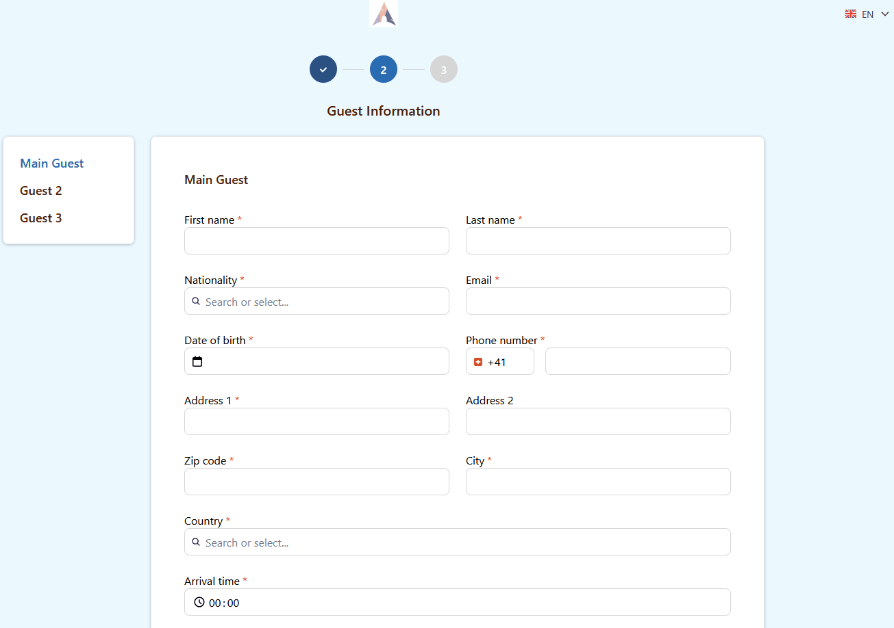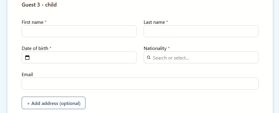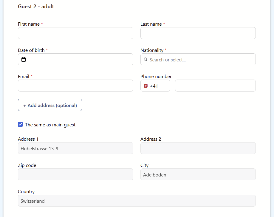 The form for additional adult guests differs slightly from the main guest’s form: the address fields are optional (with the option to use the main guest’s address if needed), and the arrival time field is not included.