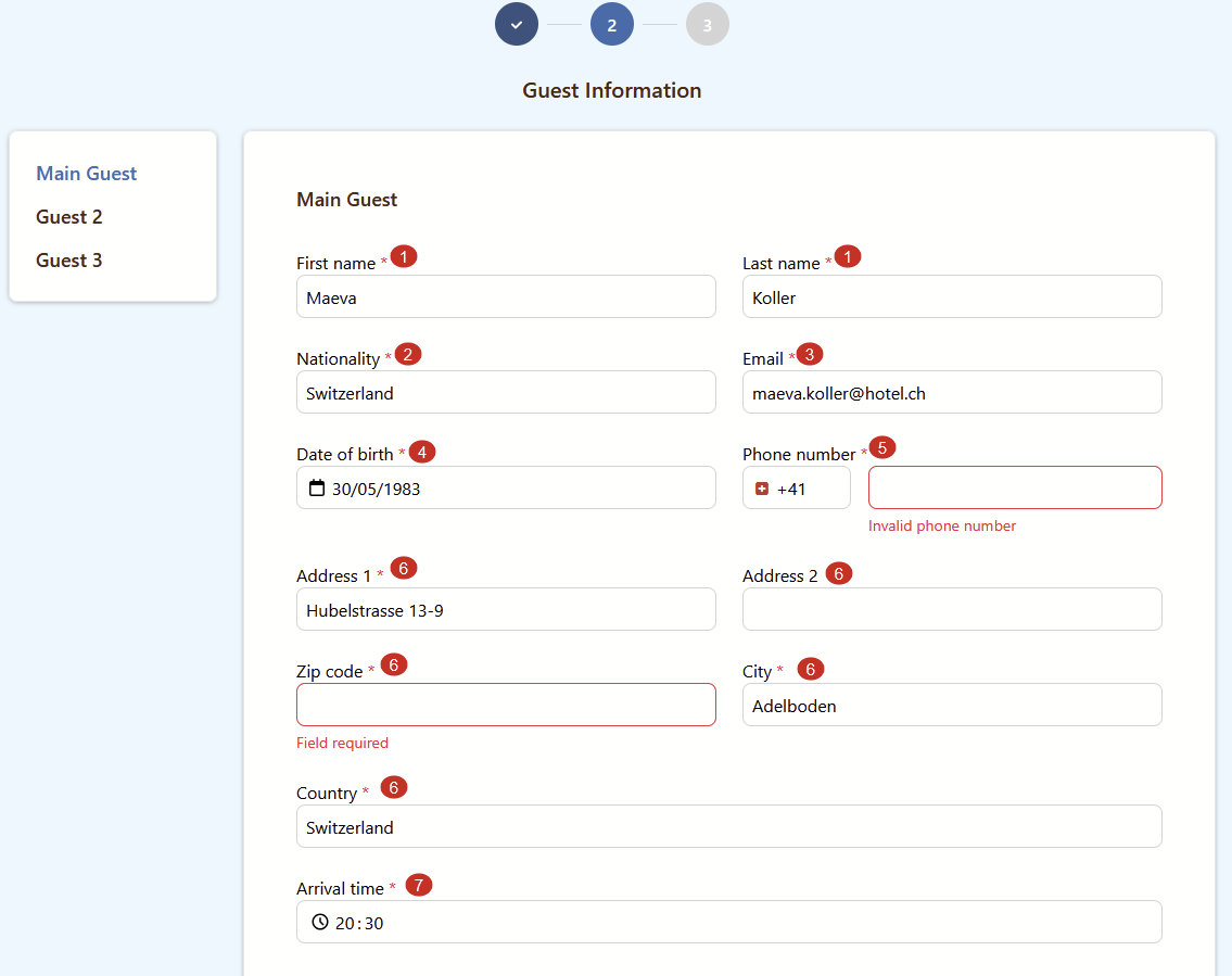 At this stage, the guest will see a form with fields to be filled out for each guest added in the previous steps. On the left, there is a list of guests - clicking on any name will navigate the user to that guest’s form for completion.