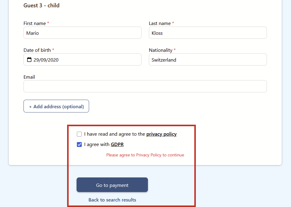 After all guest information for the current reservation has been entered, the guest must confirm consent to the privacy policy and GDPR. Redirection after clicking on PP&GDPR. If either checkbox is not selected, the system will notify the user. To proceed to the next step, click the Go to Payment button; to return to room selection, click Back to Search Results.
