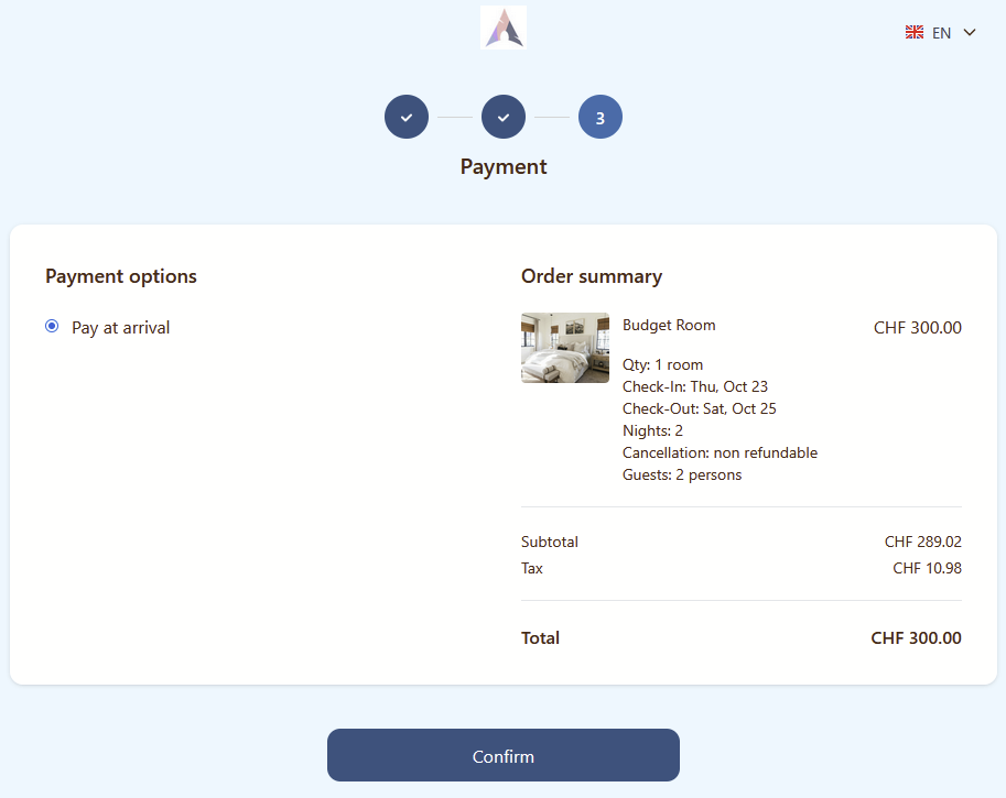 On the left side, the 'Payment option' will be available — 'Pay at arrival'.
