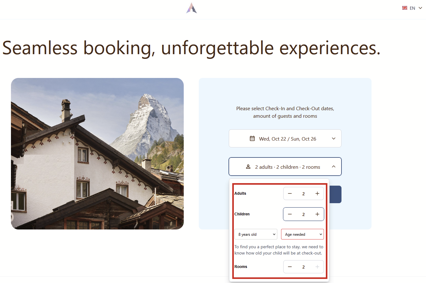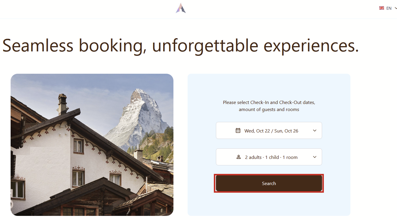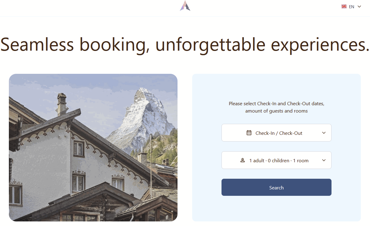 When guests open the hotel booking engine, they are greeted by a welcome page. At the top, the hotel logo is displayed. Below the hotel logo, the Booking Engine motto will be displayed. The page is divided into two sections: on the left, there’s an image of the hotel, and on the right, guests can enter their desired check-in and check-out dates, as well as the number of guests for their reservation and number of rooms.