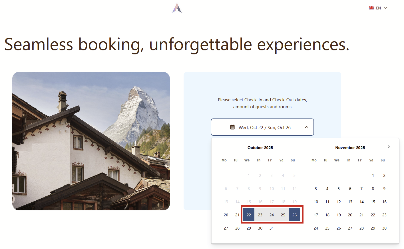 When clicking on the Check-In/Check-Out field, the system will open a calendar for selecting reservation dates. Once dates are chosen, the system will highlight the check-in and check-out dates, as well as the full reservation period.