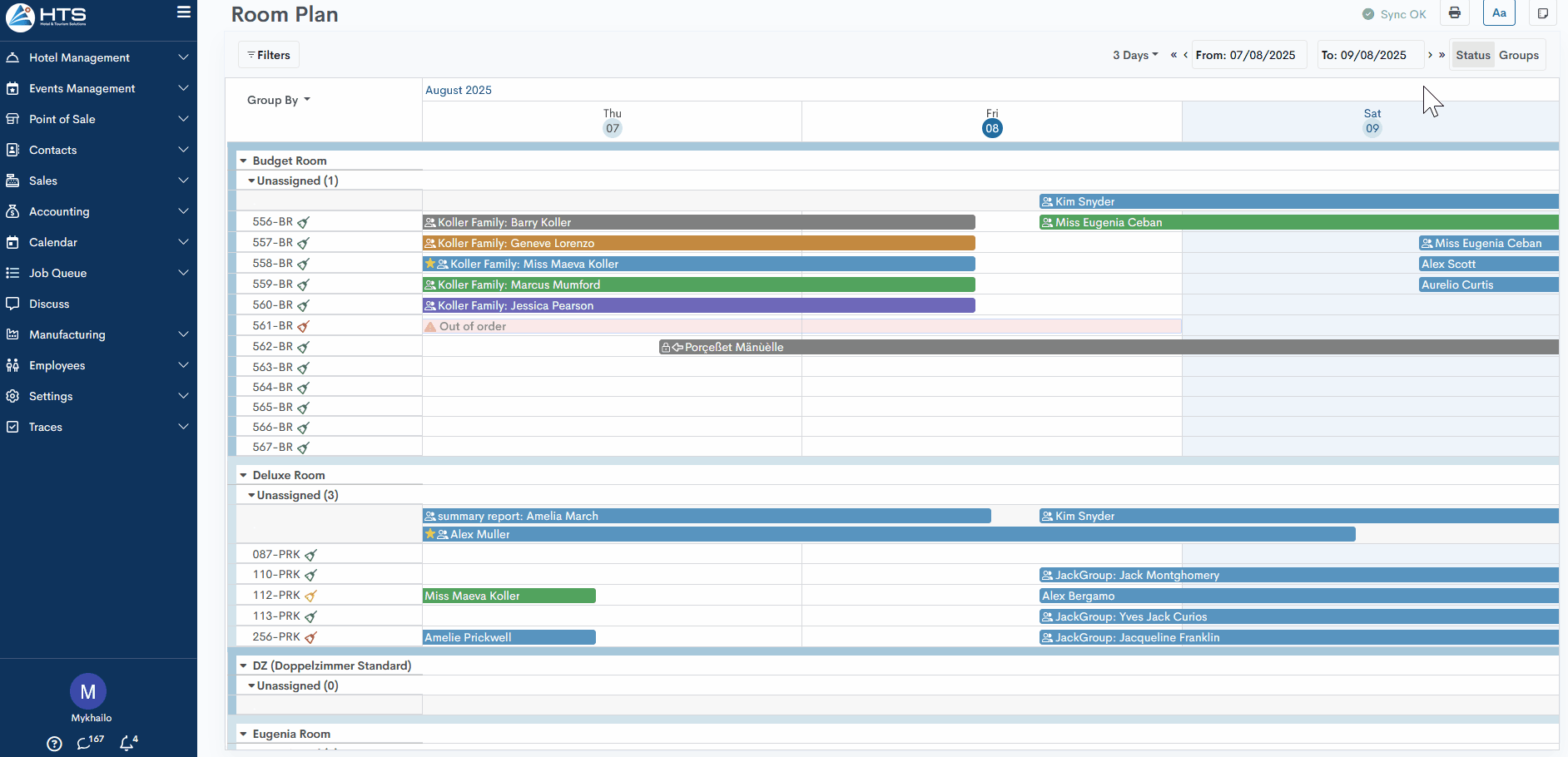 The date period control panel on the room plan is a key tool that allows users to select and adjust the time frame for which reservations and room availability are displayed. It offers predefined ranges like 3 days, 1 week, 2 weeks, 1 month, and 1 year, as well as a custom option for selecting specific dates. This flexibility helps hotel staff quickly focus on the relevant period for managing bookings and planning operations efficiently.