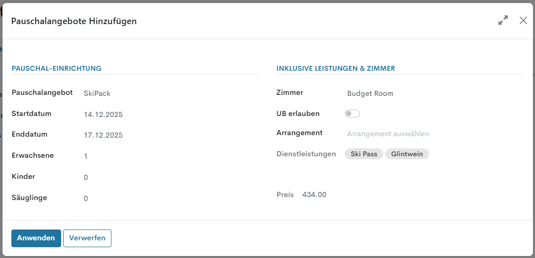 Während der vorherige Artikel „Pauschalangebote“ im Tab „Konfiguration“ den Prozess der Erstellung und Anpassung von Pauschalangeboten behandelt hat, geht dieser Artikel darauf ein, wie zuvor erstellte Pauschalangebote einer Hotelreservation hinzugefügt werden.