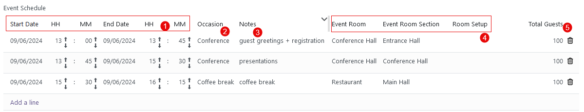 Dieser Abschnitt enthält alle notwendigen Angaben zu Datum, Uhrzeit und Zweck eines bestimmten Events. Um zu beginnen, klicken Sie auf "Zeile hinzufügen" und füllen Sie die folgenden Felder aus: