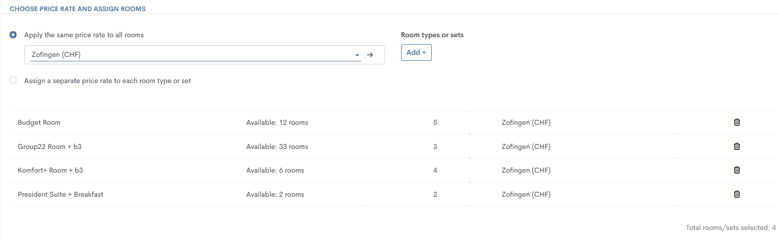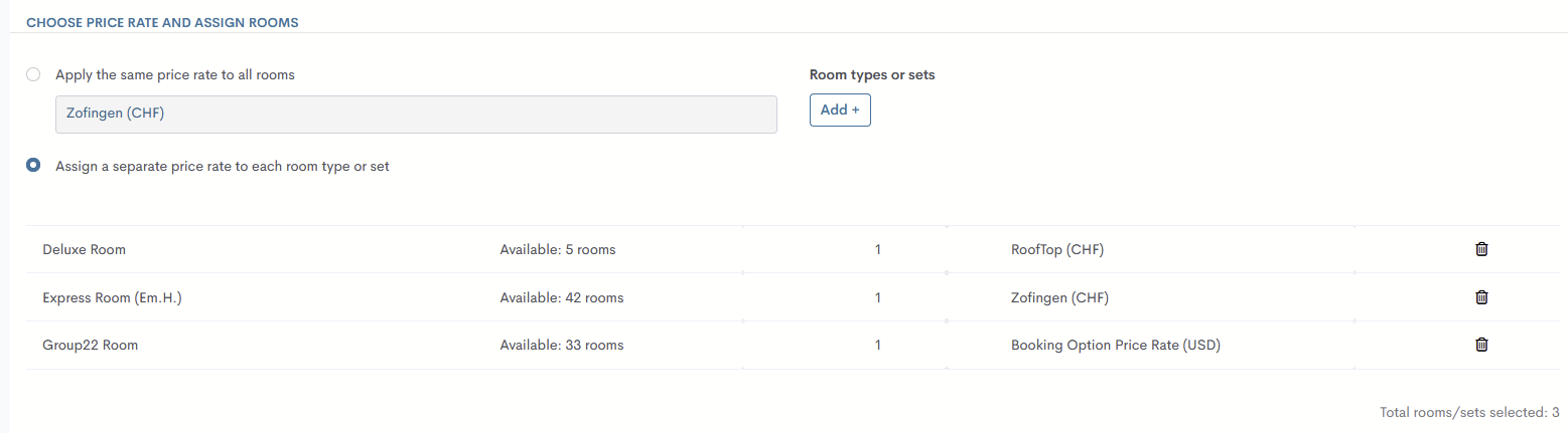 - Assign a separate price rate to each room type or set - You will need to select a price rate for each room type or set individually.