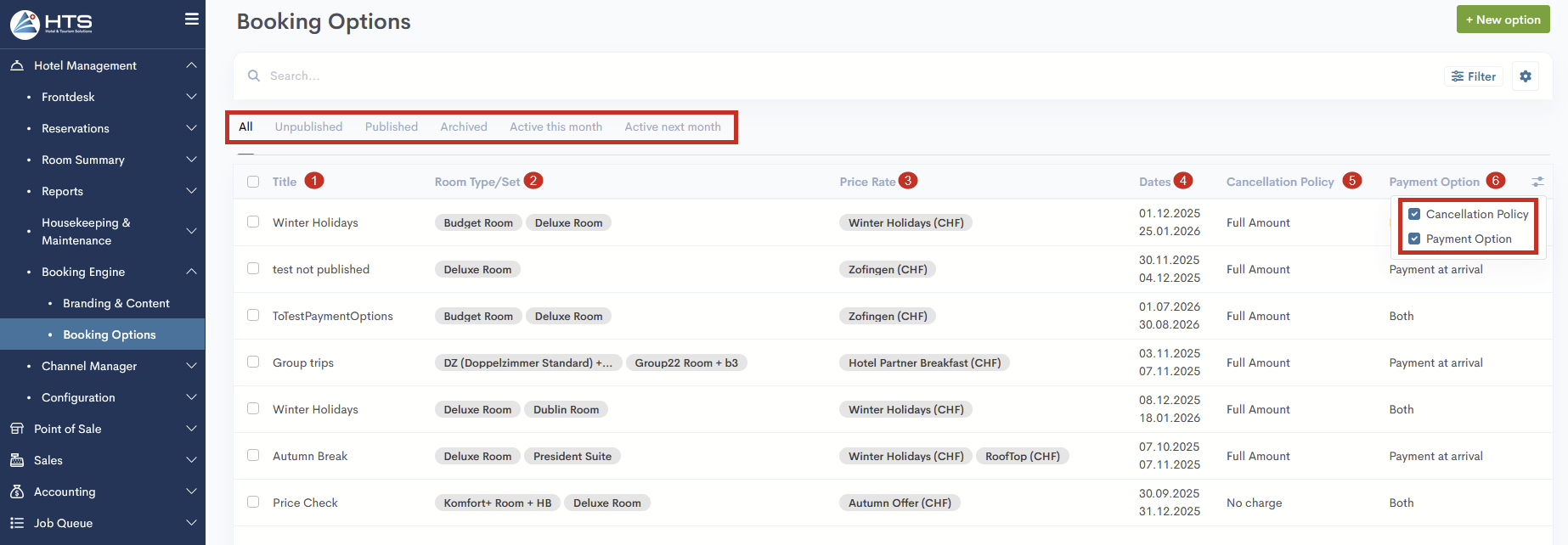 After the booking options have been configured, they will all appear in the table when opening the Booking Options menu, displayed with the following columns: