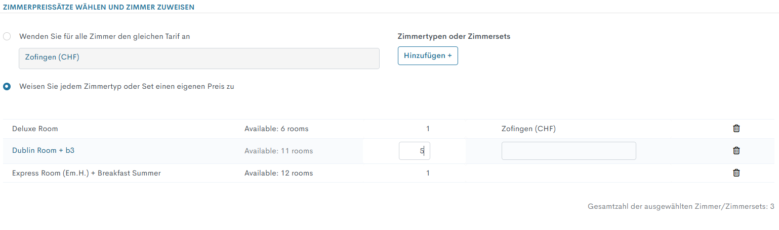 – In diesem Fall muss für jeden Zimmertyp bzw. jedes Zimmer-Set individuell eine Preisrate ausgewählt werden.