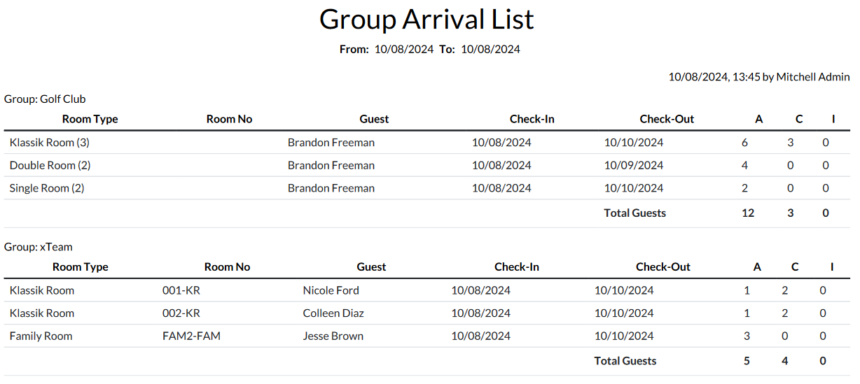 Jede Gruppenbuchung für ein bestimmtes Datum erscheint in einem separaten Abschnitt mit einem Gruppennamen oben und mit den folgenden Informationen:
