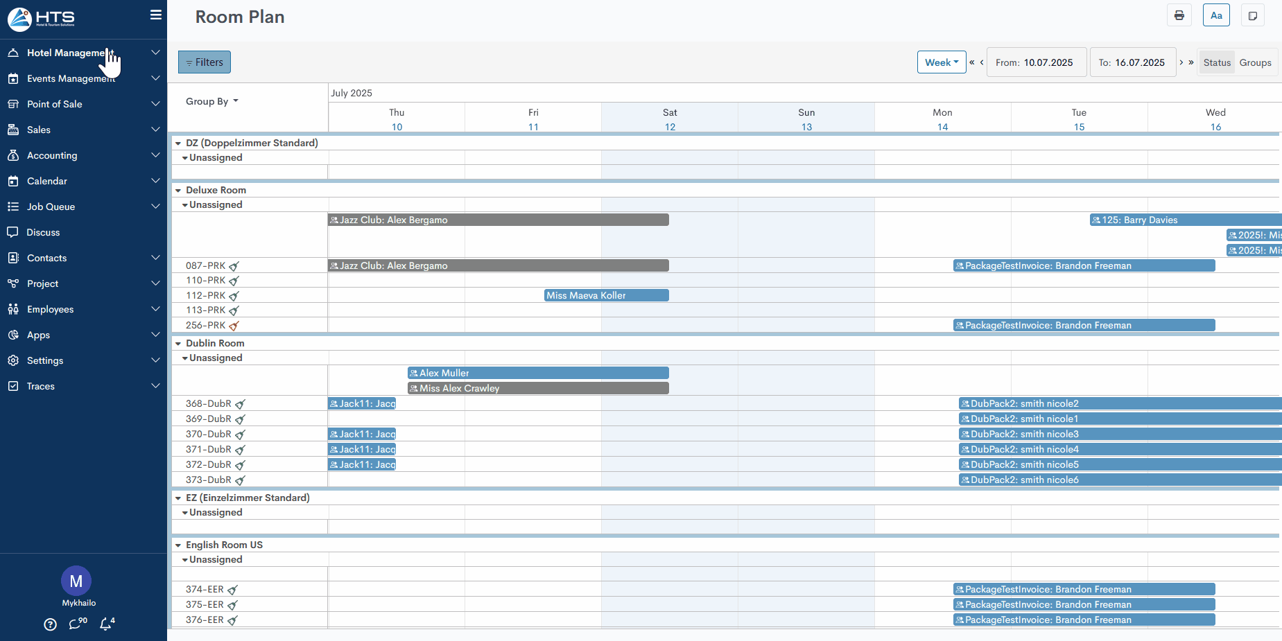 Bei Gruppenbuchungen vor der Aufteilung zeigt das System die Zimmerart und die Anzahl der Zimmer in Klammern an - Doppelzimmer (2), Klassik (4), usw. Nach der Aufteilung hat jeder Gast eine eigene Zimmernummer.