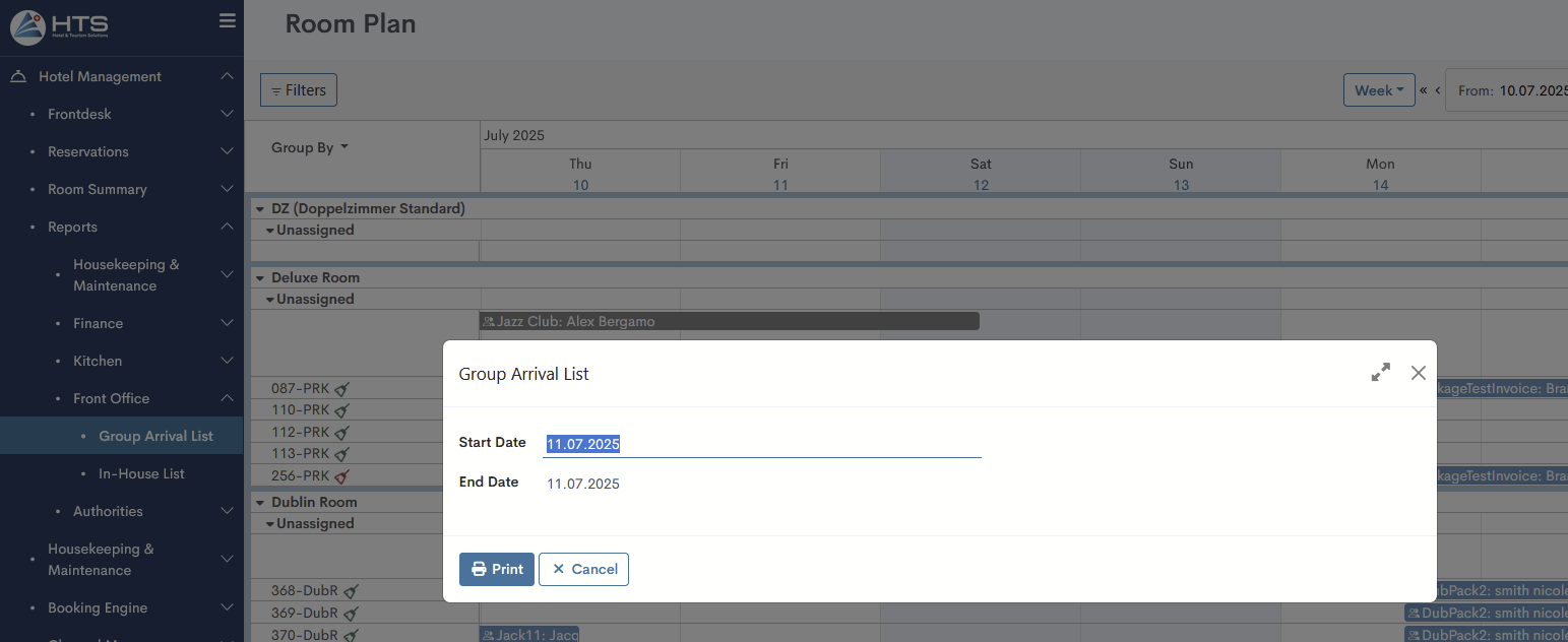 - klicken Sie auf die "Gruppenankunft Liste" in dem "Front Office" Abschnitt.