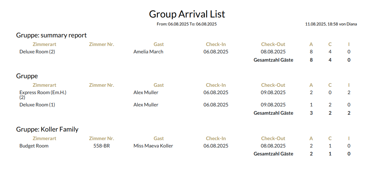 Jede Gruppenbuchung für ein bestimmtes Datum erscheint in einem separaten Abschnitt mit einem Gruppennamen oben und mit den folgenden Informationen: