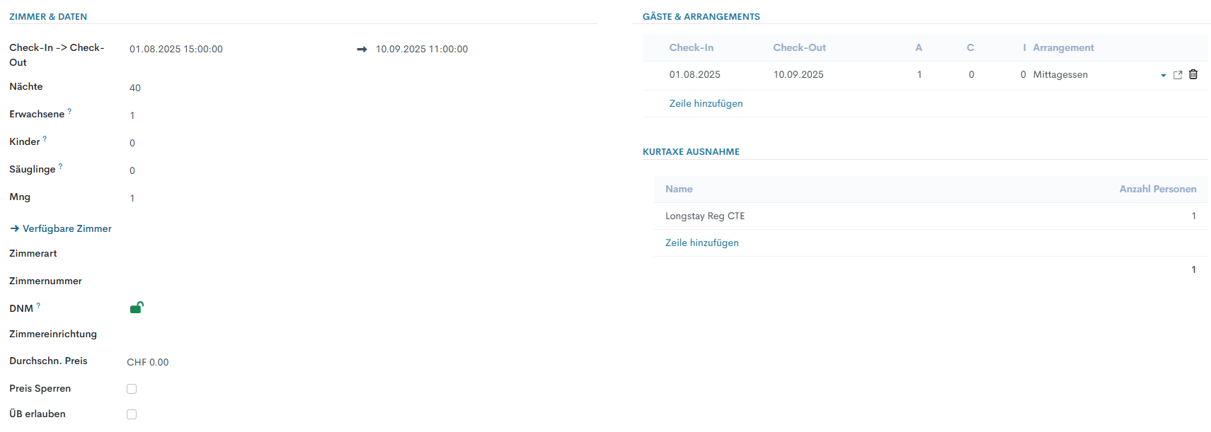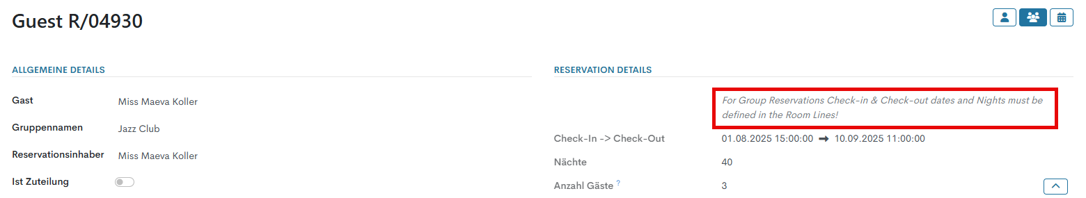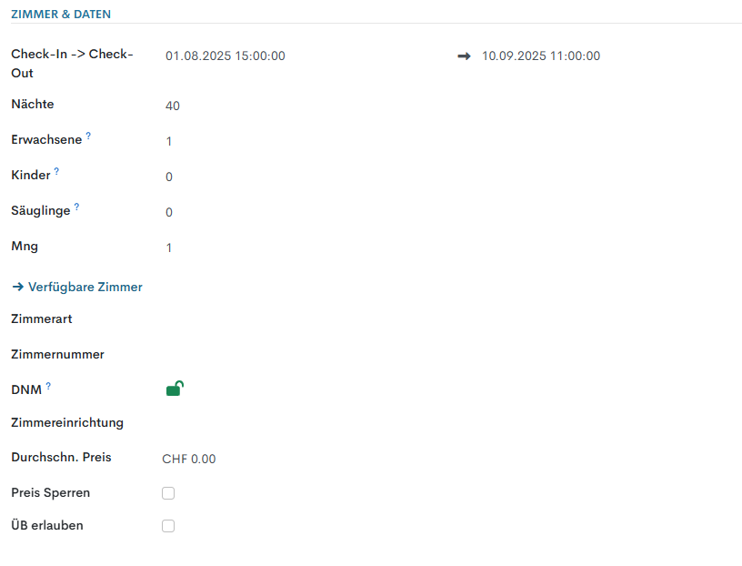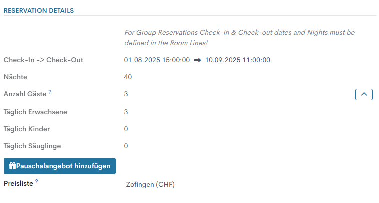 In diesem Abschnitt werden alle Informationen über Reservationsdaten, Anzahl Gäste, Zimmerarten usw. angegeben: