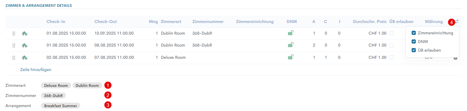- Arrangement - alle Arrangements, die in allen Zimmerzeilen hinzugefügt sind, werden angezeigt.