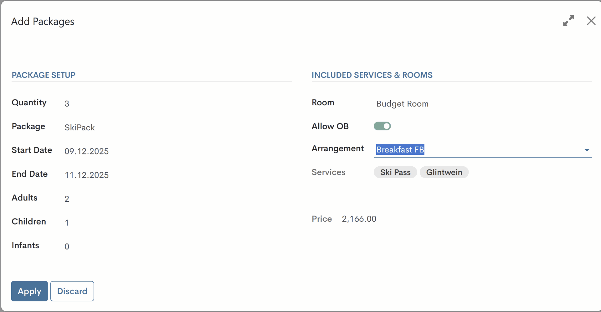 - Qty - indicate the quantity of rooms that will have the selected package(s) added;