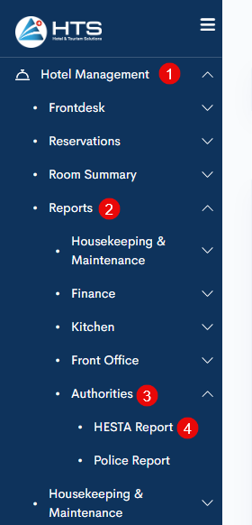 Alle Hotelberichte sind auf der Registerkarte "Berichte" im Modul "Hotel Management" verfügbar. Diese Berichte sind in verschiedene Abschnitte unterteilt - Küchenberichte, Front Office, Finanzen, etc. Um einen HESTA-Bericht zu erstellen, gehen Sie folgendermaßen vor: