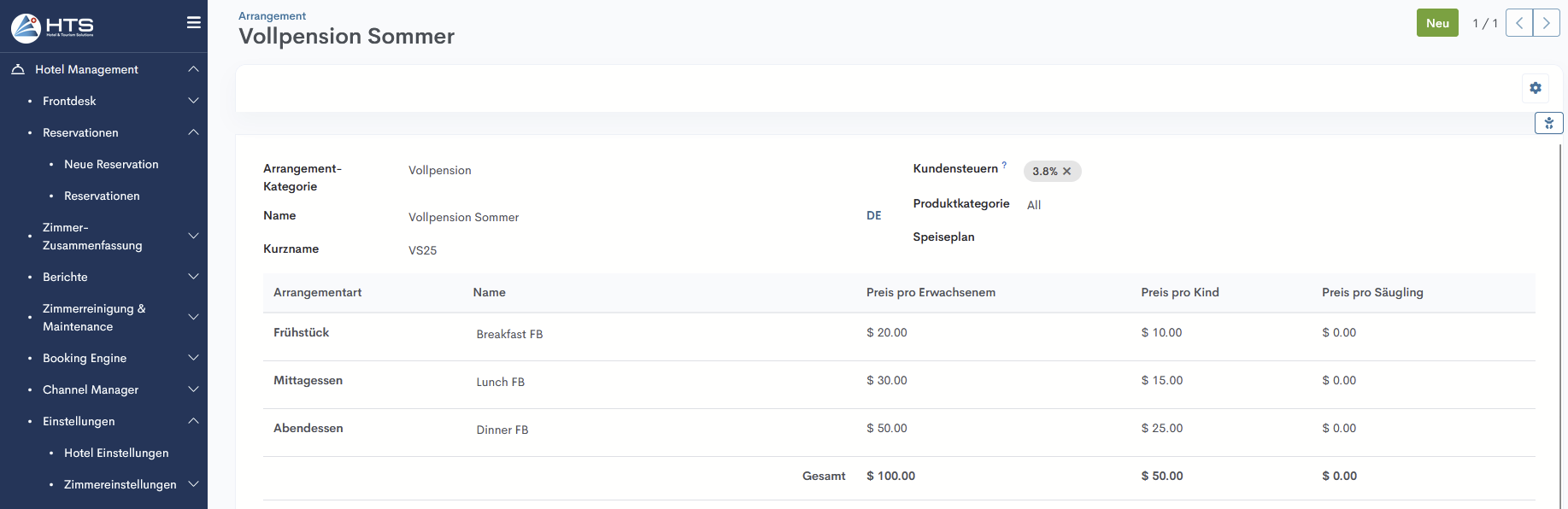 Wenn Sie dieses „Vollpension“-Kombi-Arrangement zu einem Pauschalangebot mit einem reduzierten Preis von z.B. 80$ hinzufügen, wird der Preis für jede Komponente wie folgt sein: