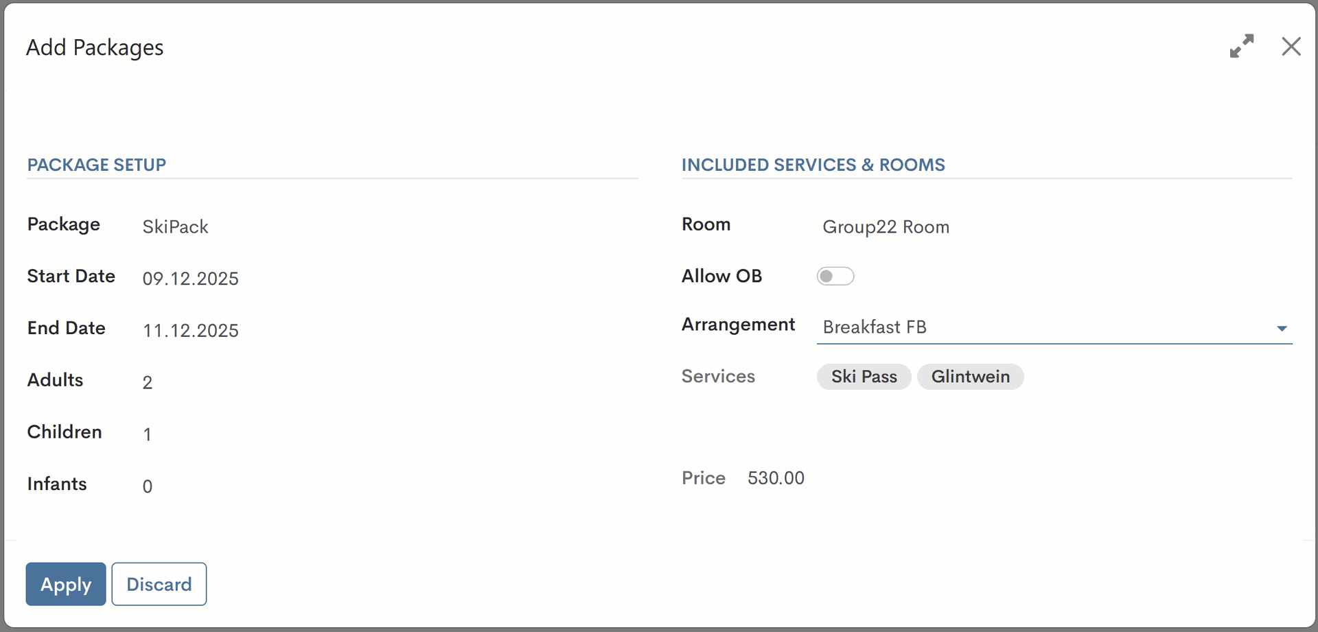 When a package is added in the form, click 'Apply' - the system creates room and arrangement lines, and also computes all products in the 'Overview' section due to the 'Price applicability' setting during package setup.