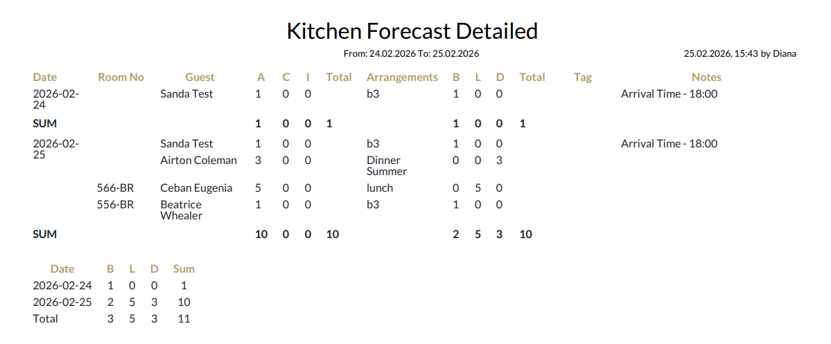 Am Ende jedes Tages wird in einer Zeile „SUM“ die Gesamtzahl der Gäste (A/C/I) und Mahlzeitenarten (B/L/D) zusammengefasst. Darüber hinaus wird am Ende des Berichts eine Übersichtstabelle für den gesamten Berichtszeitraum angezeigt.