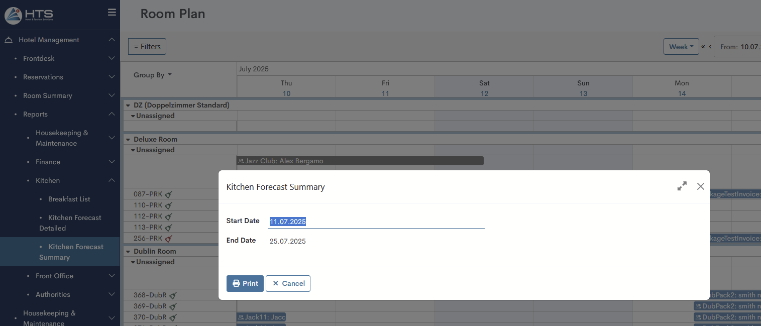 Alle Hotelberichte sind auf der Registerkarte "Berichte" im Modul "Hotelmanagement" verfügbar. Diese Berichte sind in verschiedene Abschnitte unterteilt - Küchenberichte, Front Office, Finanzen, etc. Um eine Zusammenfassung der Küchenvorhersage zu erstellen, gehen Sie folgendermaßen vor: