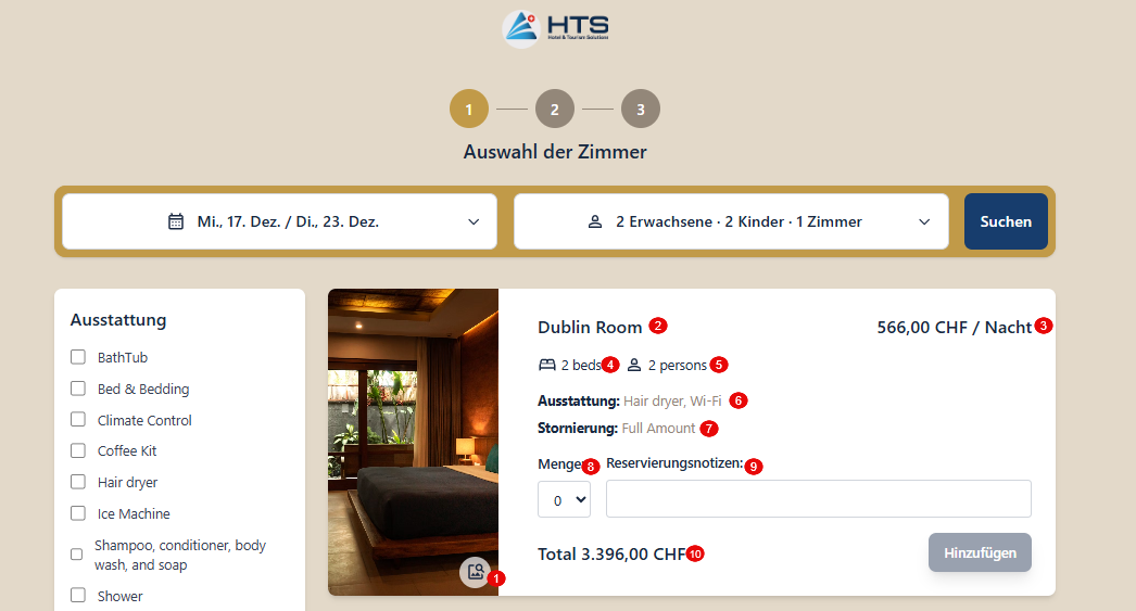 - Anzahl - ausgewählte Anzahl der Zimmer.