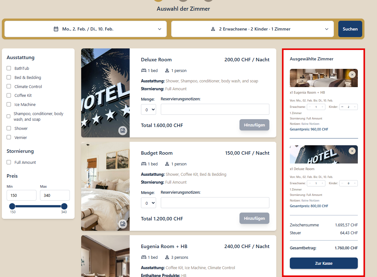 Nachdem der Gast bei einem oder mehreren Zimmern auf Add geklickt hat, erscheint auf der Seite ein dritter Bereich namens Ausgewählte Zimmer, der die Liste der gewählten Zimmer anzeigt. In diesem Bereich kann der Gast über die entsprechenden Felder in jeder Zimmerkarte Erwachsene und Kinder für jedes Zimmer zuordnen. Darunter wird der Gesamtpreis der Reservation angezeigt. Um zum nächsten Schritt fortzufahren, klickt der Gast auf die Schaltfläche Zur Kasse.