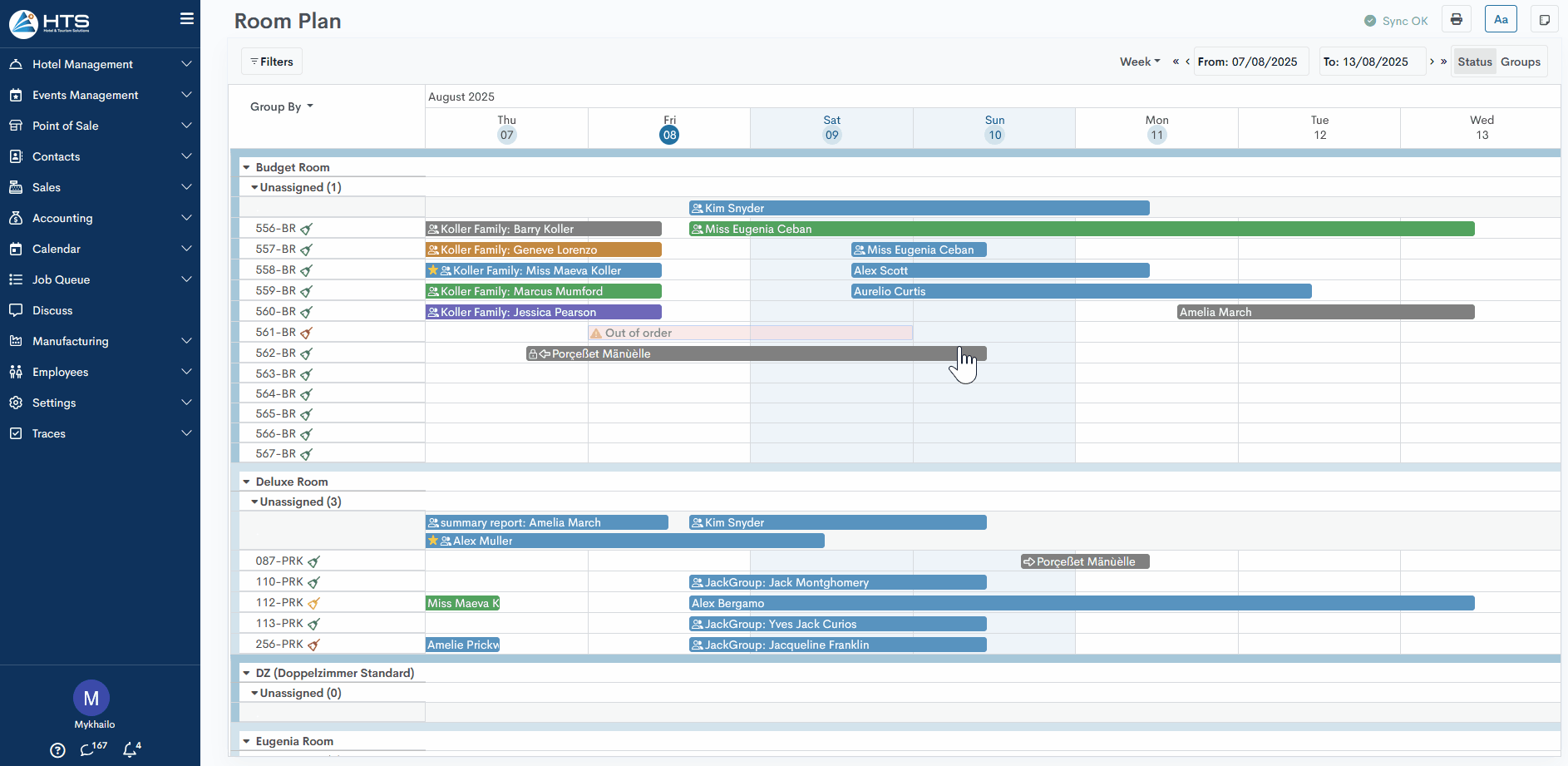 The process of creating a maintenance reservation is described in a separate article. When a maintenance is created for a room, it will be displayed on the room plan as a separate bar with a pink background and the label "Out of Order". The system also allows extending or shortening the maintenance order period directly on the room plan. When clicking on the maintenance bar, the system will redirect the user to the maintenance order mask to view additional details such as the current status, notes, and more.