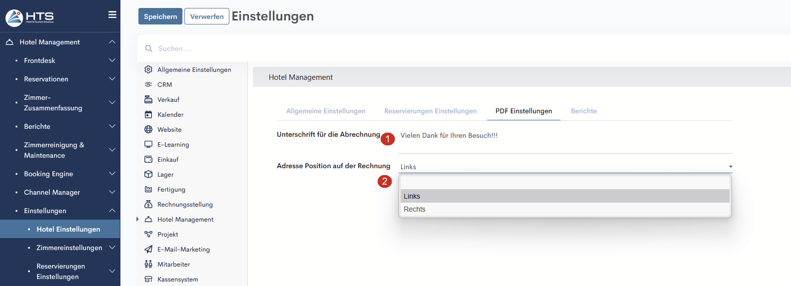 Im HTS finden die User eine eigene Registerkarte mit der Bezeichnung „PDF-Einstellungen“ im Einstellungsmenü. Mit dieser Funktion ermöglicht es Usern ihre Abrechnung-PDFs nach ihren eigenen Vorstellungen anzupassen.