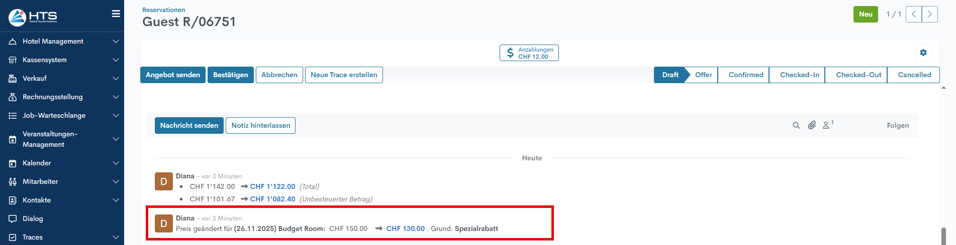 Hotelmitarbeitende müssen gelegentlich den Preis eines bestimmten Artikels in der Reservations-Übersicht anpassen – zum Beispiel, um einen Rabatt zu gewähren, einen erfassten Wert zu korrigieren oder eine Sondervereinbarung mit dem Gast abzubilden.