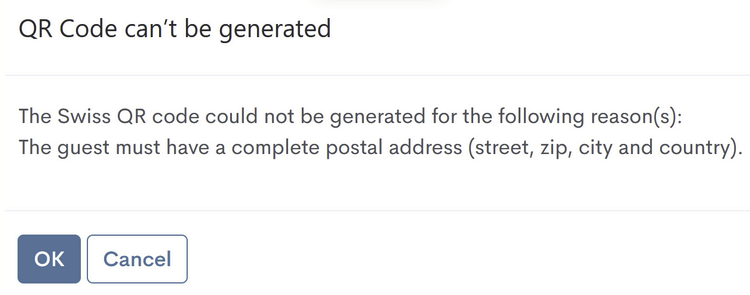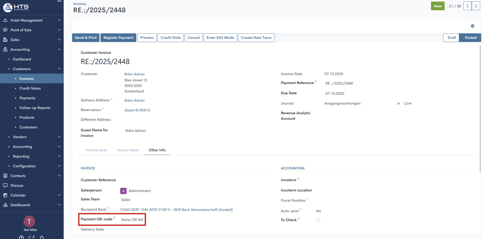 After the guest invoice has been created, go to the Other Info tab in the Invoice section and check whether the Payment QR-code field is filled with the Swiss QR Bill option.