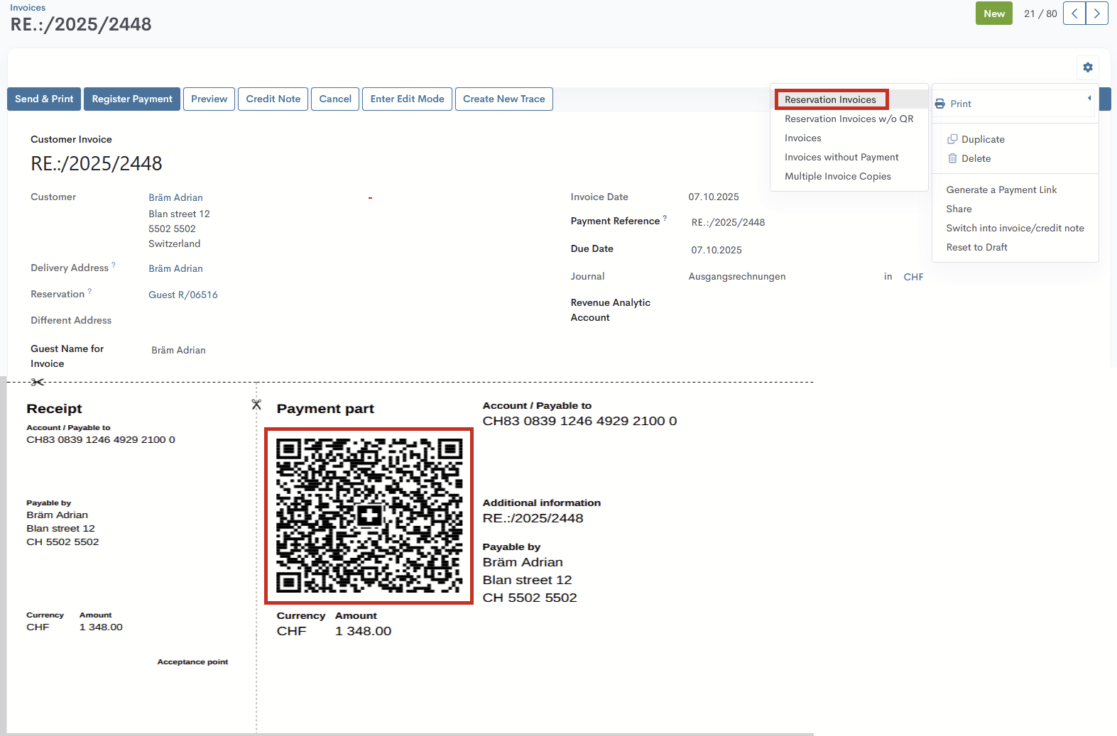 After that, generate the invoice PDF via Actions → Print → Reservation Invoices. The QR code for this invoice will be generated at the bottom of a separate page.