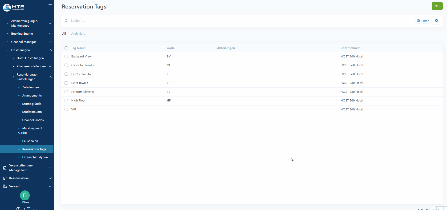 For Beispiel: Wenn das Schlagwort „extra Handtuch“ mit der Abteilung „Housekeeping“ zur Reservation hinzugefügt wird, wird es im HSK-Bericht angezeigt.
