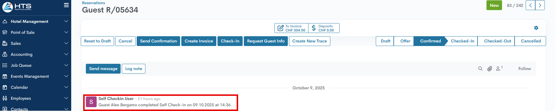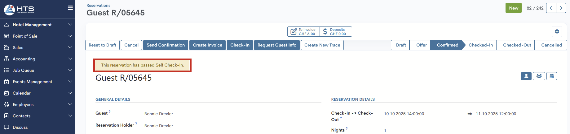 After the guest completes the self check-in, the system will display a banner at the top of the reservation form with the following text: “This reservation has passed Self Check-In.”
