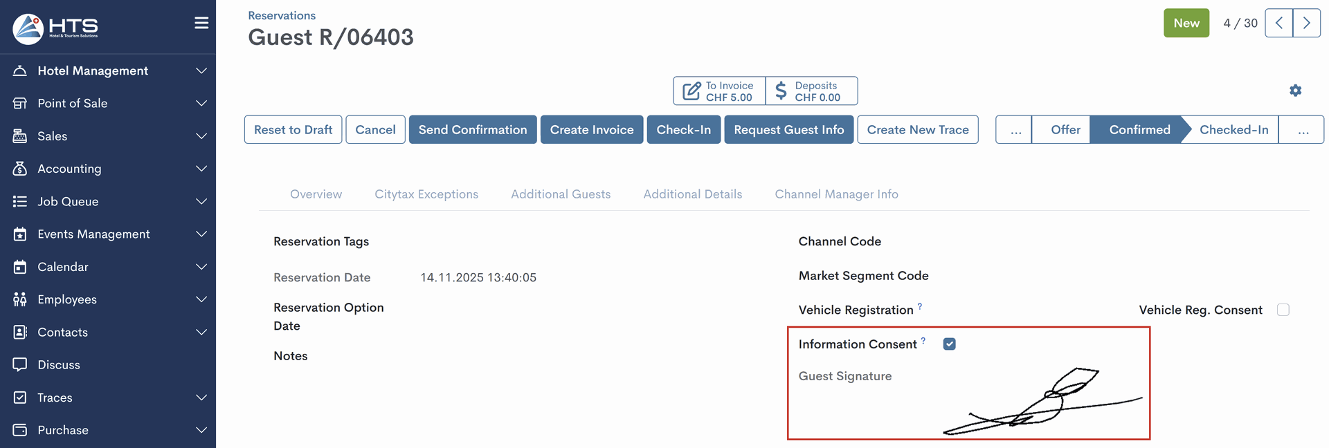 In the Additional Details tab, after completing the self check-in, the system enables the Information Consent checkbox and adds a read-only Signature field that stores the guest’s signature.