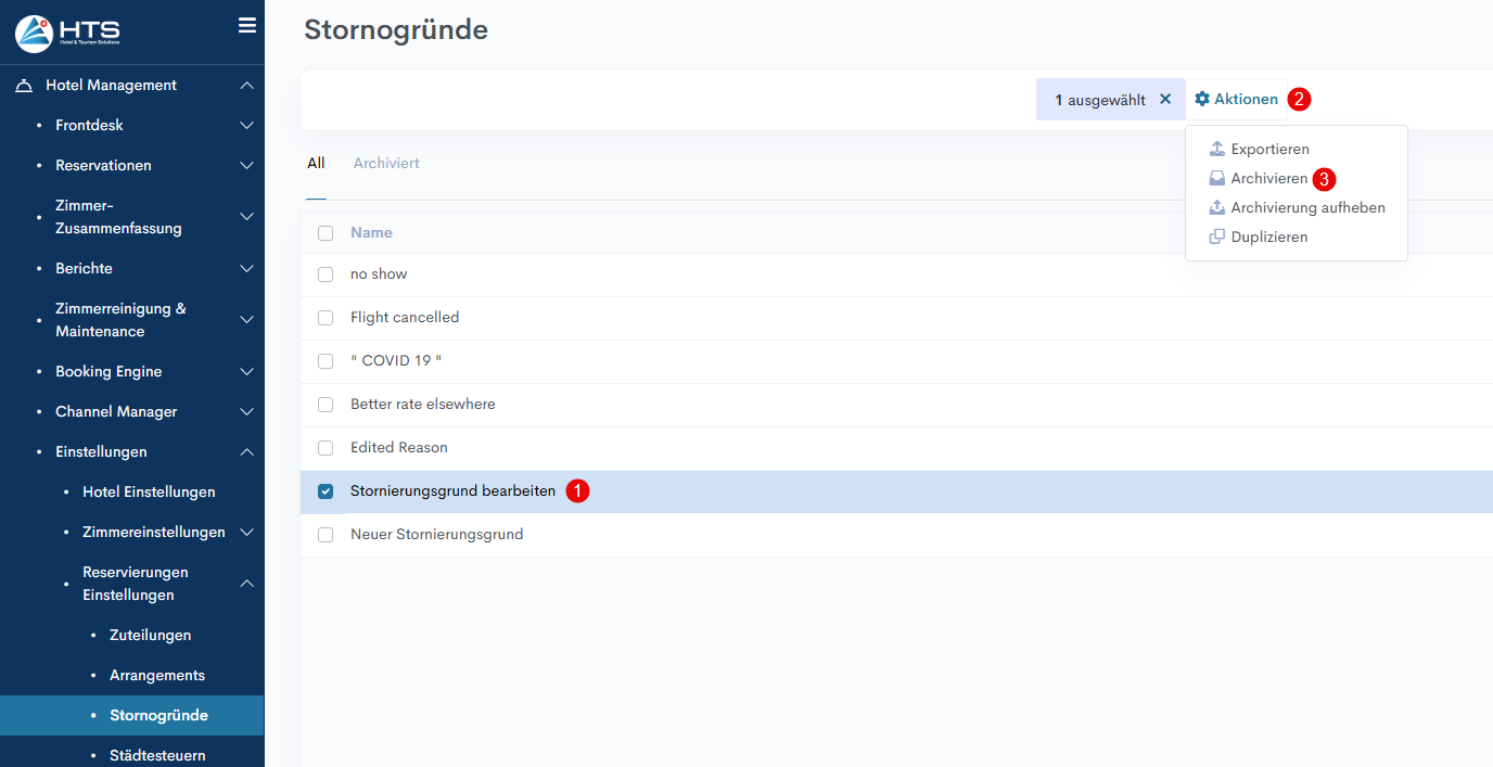 Diese Phase des Anlegens von Stornierungsgründen ist der erste Schritt zur Umsetzung des korrekten Stornierungsprozesses in Ihrem Hotel. Dieser Prozess wird in den folgenden Artikeln ausführlicher beschrieben - So stornieren Sie einzelne Reservationen und so stornieren Sie eine Gruppenreservation.
