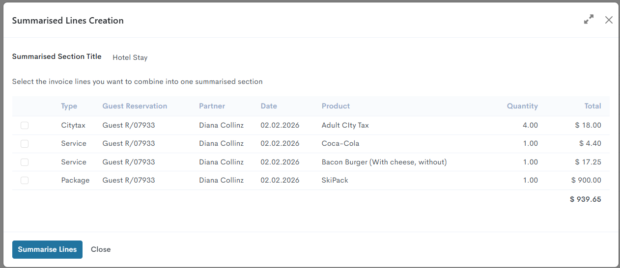 At the top of the wizard will be displayed the title of the new section of the summarised lines. “Hotel Stay“ is a default title that can be changed. Below is an informative message, which explains what needs to be done: “Select the invoice lines you want to combine into one summarised section.“