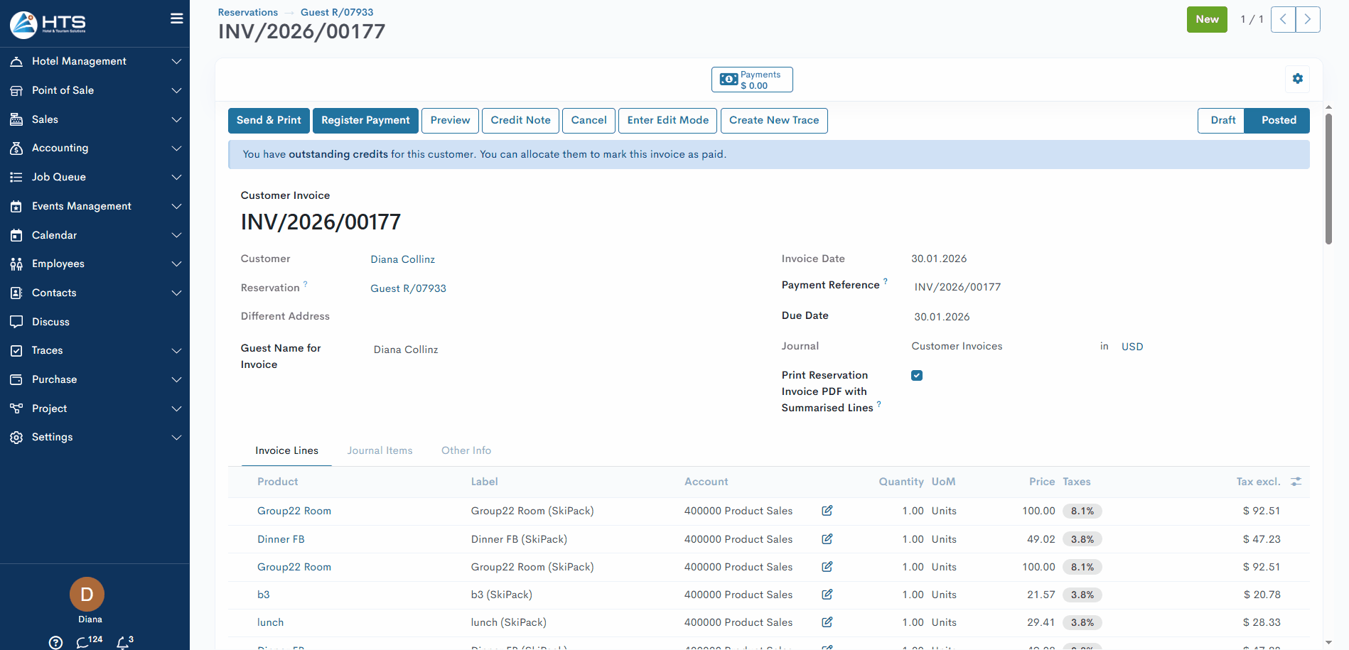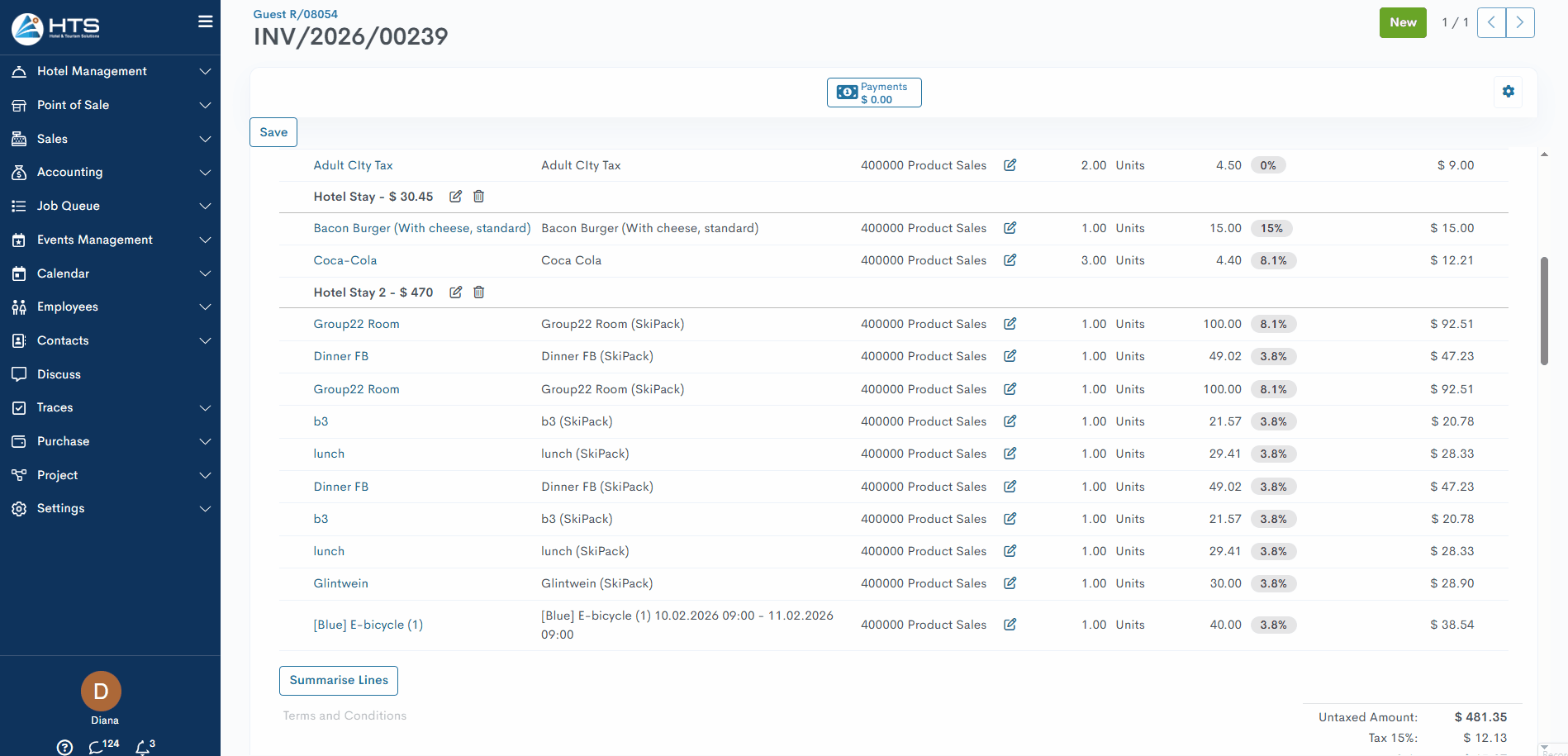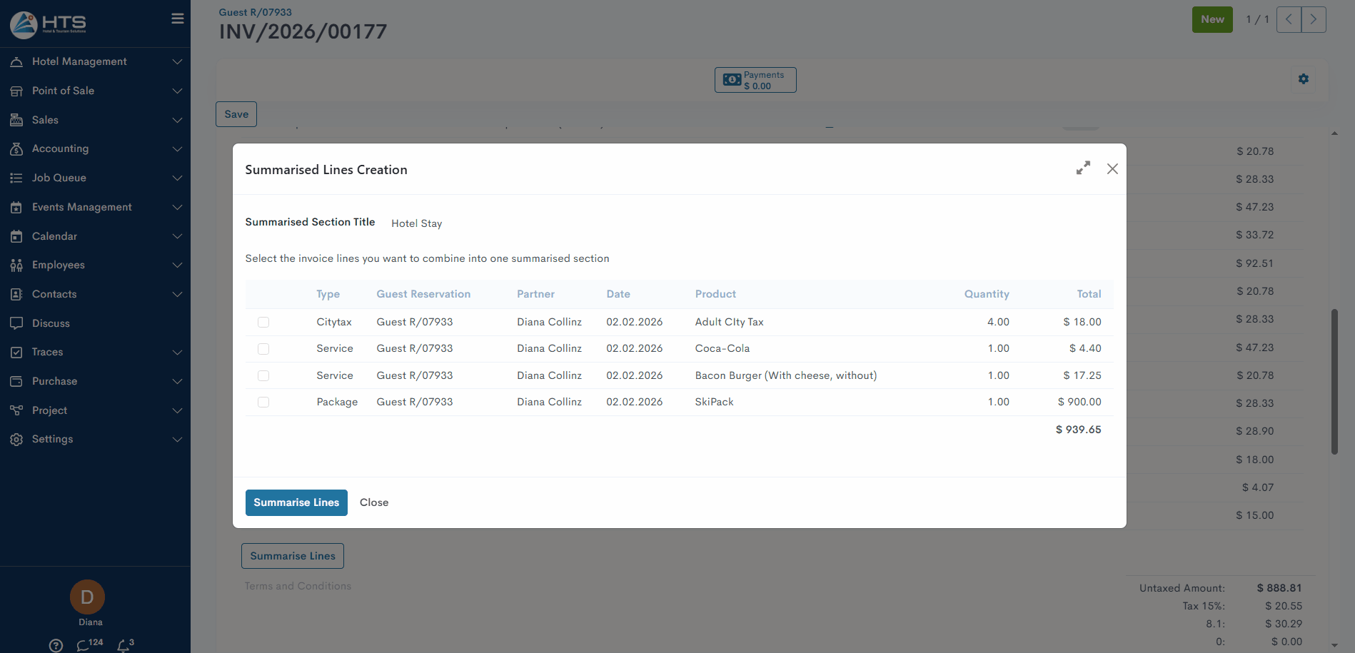 The "Summarised Lines" feature allows hotels to combine multiple invoice items into one line while keeping correct VAT calculations.