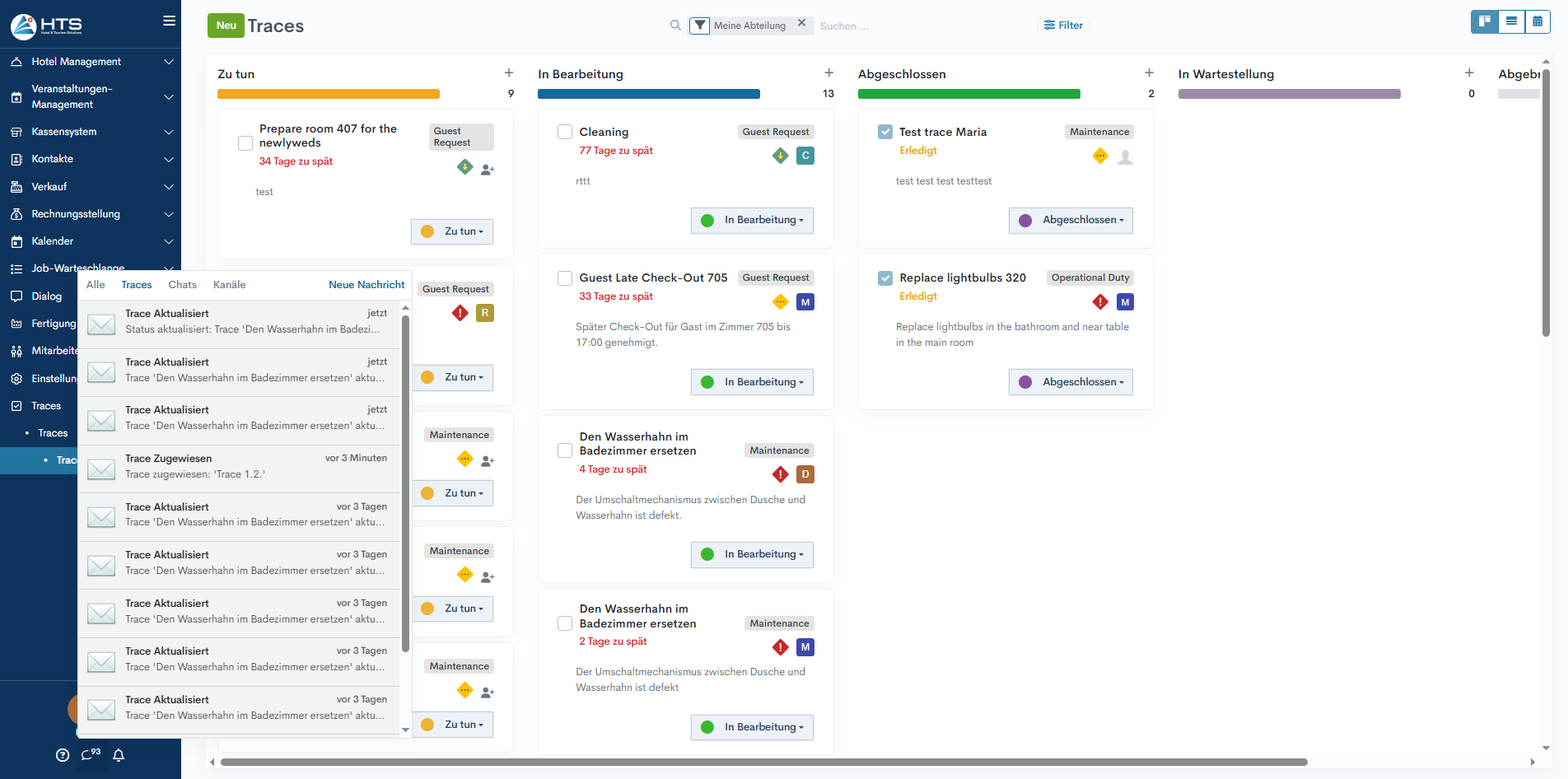 Das System bietet integrierte Benachrichtigungen, die Benutzer dabei unterstützen, über ihre zugewiesenen Traces informiert zu bleiben. Diese Benachrichtigungen stellen sicher, dass kein wichtiger Trace übersehen wird und Teammitglieder an bevorstehende oder überfällige Aufgaben erinnert werden. Die Benachrichtigungen erscheinen direkt in der Systemoberfläche und liefern rechtzeitige Hinweise für ein effektives Trace-Management.