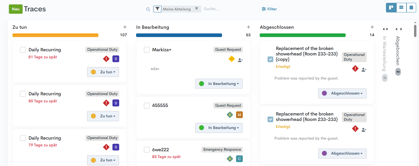 Um verschiedenen Arbeitsabläufen und Vorlieben gerecht zu werden, bietet das System mehrere Ansichten zur Arbeit mit Traces an. Benutzer können je nach Aufgabe und persönlicher Präferenz zwischen der Kanban-, Listen- oder Kalenderansicht wählen. Jede Ansicht bietet eine unterschiedliche Perspektive und Detailtiefe.