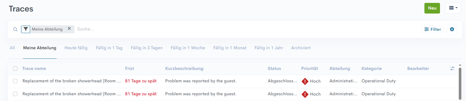 • Kategorien - Zur besseren Klassifizierung von Traces enthält das System verschiedene Kategorien wie Notfallmaßnahmen, Wartung, Gästeanfrage und andere. Die Kategorisierung hilft dabei, den Trace der richtigen Abteilung zuzuweisen und verbessert den Arbeitsablauf.