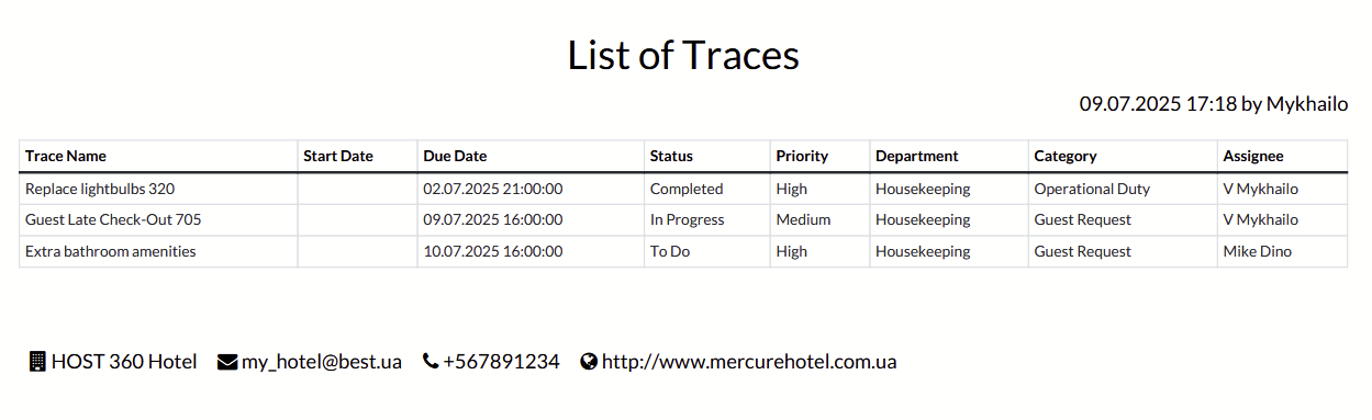 In the Traces List view, when multiple traces are selected, the system allows users to print a List of Traces. This printout includes the same columns as shown in the table (e.g., trace name, status, due date, etc.). Additionally, the list contains the date and time of printing at the top, as well as the hotel's contact information at the bottom of the page.