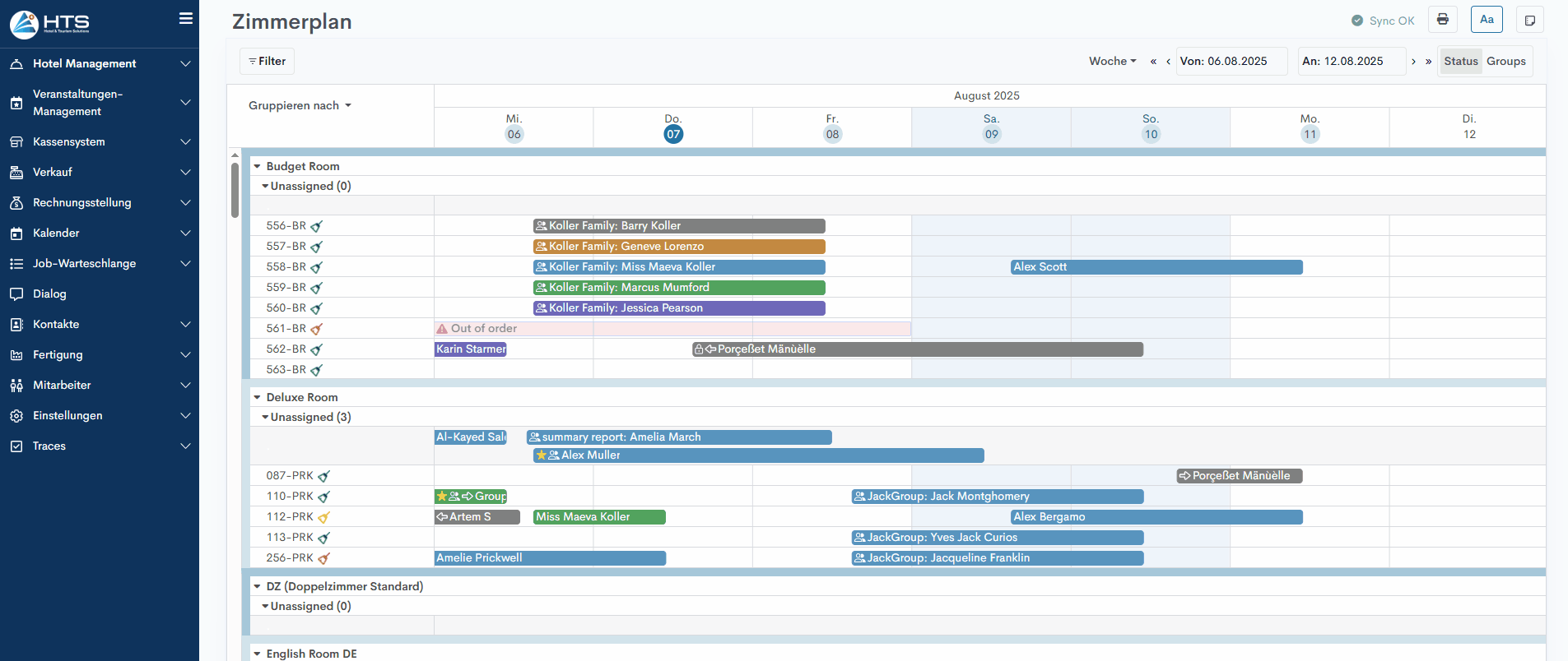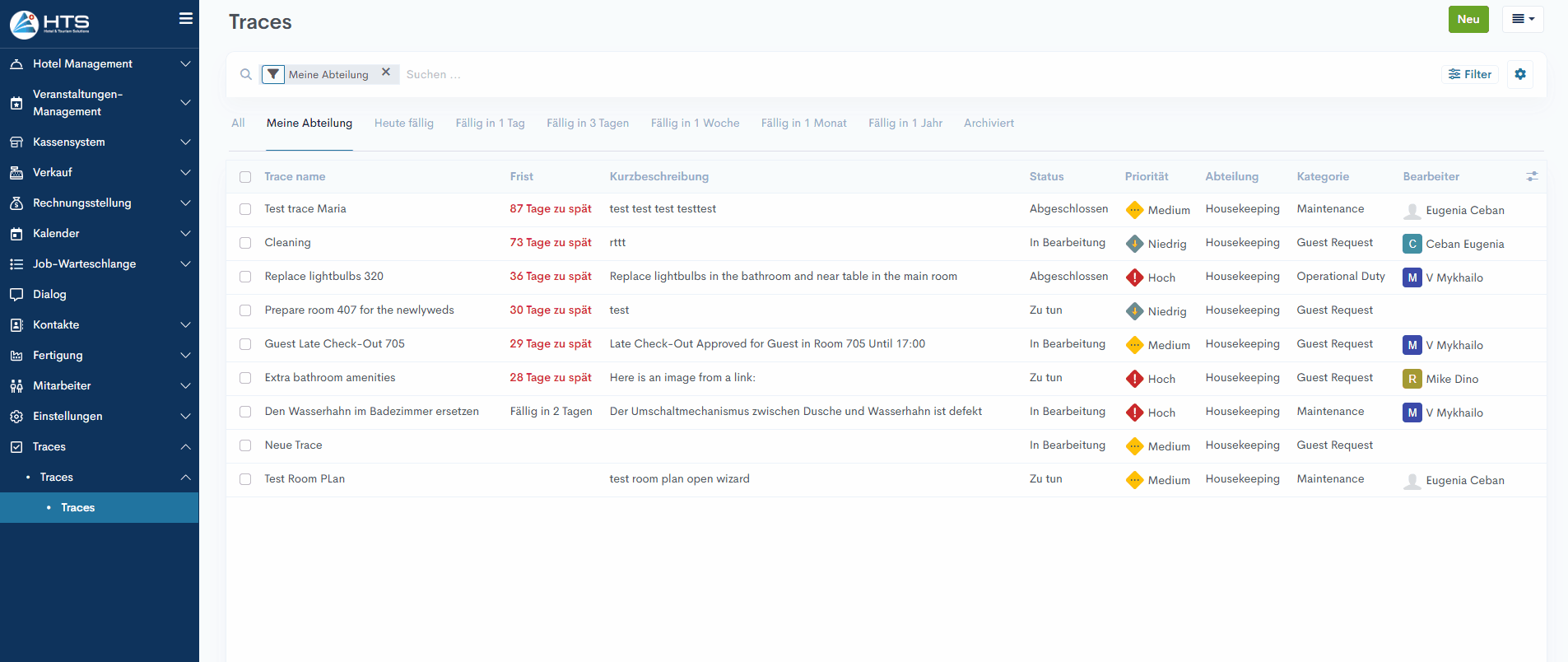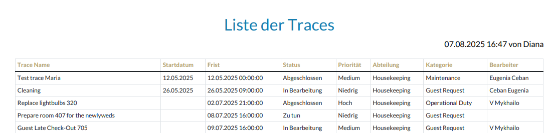 In der Traces-Listenansicht ermöglicht das System bei Auswahl mehrerer Traces den Druck einer Liste von Traces. Der Ausdruck enthält dieselben Spalten wie in der Tabelle angezeigt (z. B. Trace-Name, Status, Fälligkeitsdatum usw.). Zusätzlich enthält die Liste das Druckdatum und die Uhrzeit oben sowie die Kontaktdaten des Hotels am unteren Seitenrand.