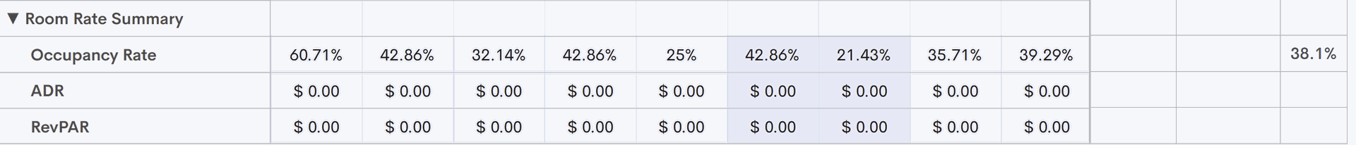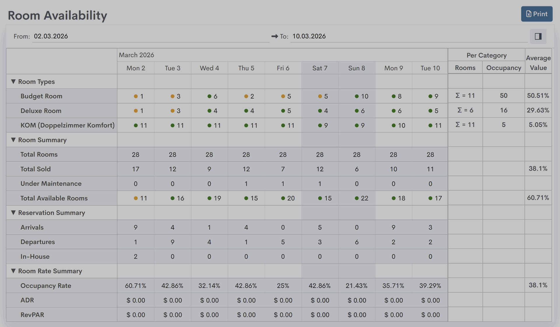 - Zimmerarten - Jede Zimmerart im System hat eine eigene Zeile, in der das System die Anzahl der verfügbaren Räume dieses Raumtyps anzeigt. Am Ende jeder Zeile zeigt das System für jede Zimmerart die Gesamtzahl der Zimmer für den ausgewählten Datumsbereich, die Anzahl der gebuchten Zimmer und die durchschnittliche Belegung für jede Zimmerart an.