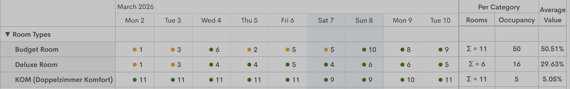 Neben der Anzahl der verfügbaren Zimmer befindet sich ein Indikator, dessen Farbe die Belegung der einzelnen Zimmertypen anzeigt. Grün steht für viele verfügbare Zimmer, gelb für eine mittlere Belegung und rot für eine annähernd volle Belegung.