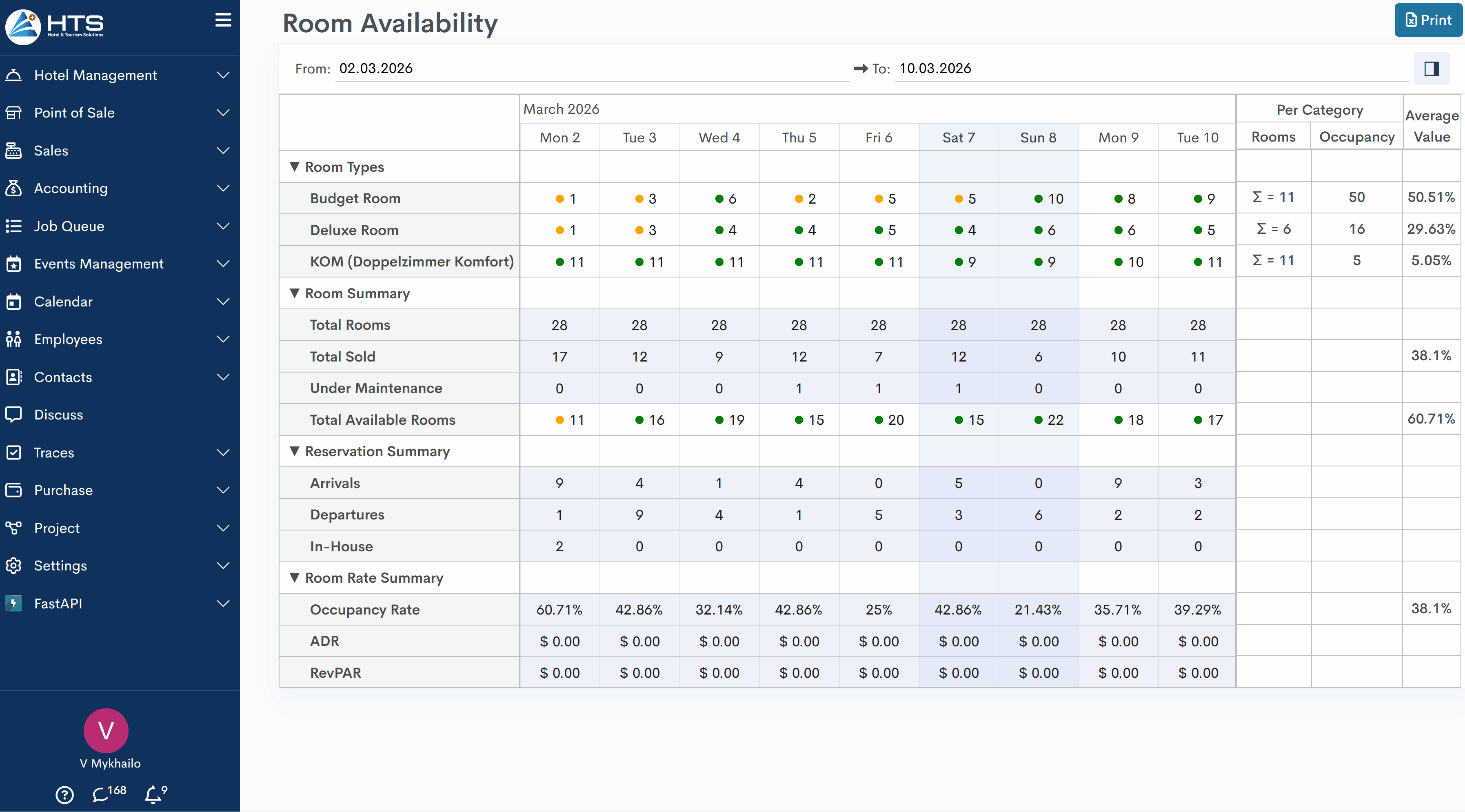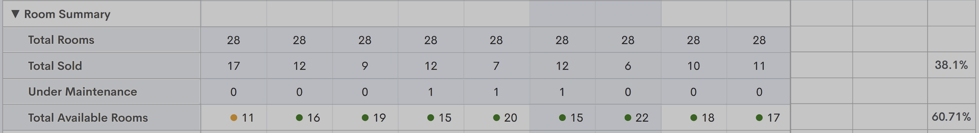 - Room Summary - section contains information about the total number of rooms in the hotel in the Total Rooms field, the total number of sold rooms for each of the dates in the Total Sold field, the total number of rooms under the maintanance and are currently not available due to this in the Under Maintanance, and the Total Available Rooms field - the total number of available rooms for each of the dates. Also for the Total Sold field and the Total Available Rooms field system calculates the average occupancy values;