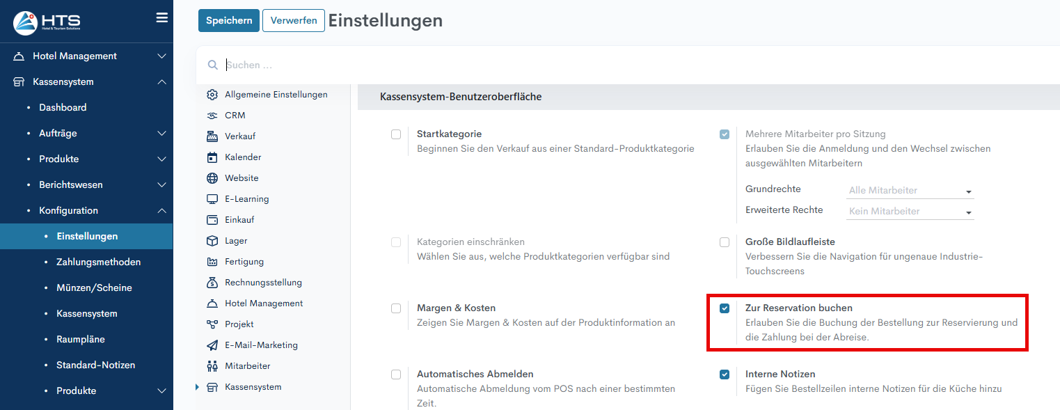 5. Aktivieren Sie im Abschnitt «Kassensystem-Benutzeroberfläche» das Kontrollkästchen neben «Zur Reservation buchen»