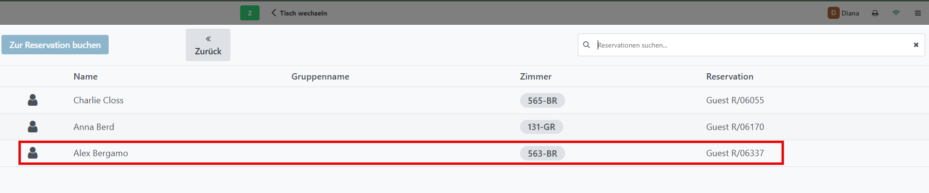 5.  Wählen Sie im neuen Fenster aus der Liste die gewünschte Gäste- oder Gruppenreservation aus, der die Buchung zugeordnet werden soll.
