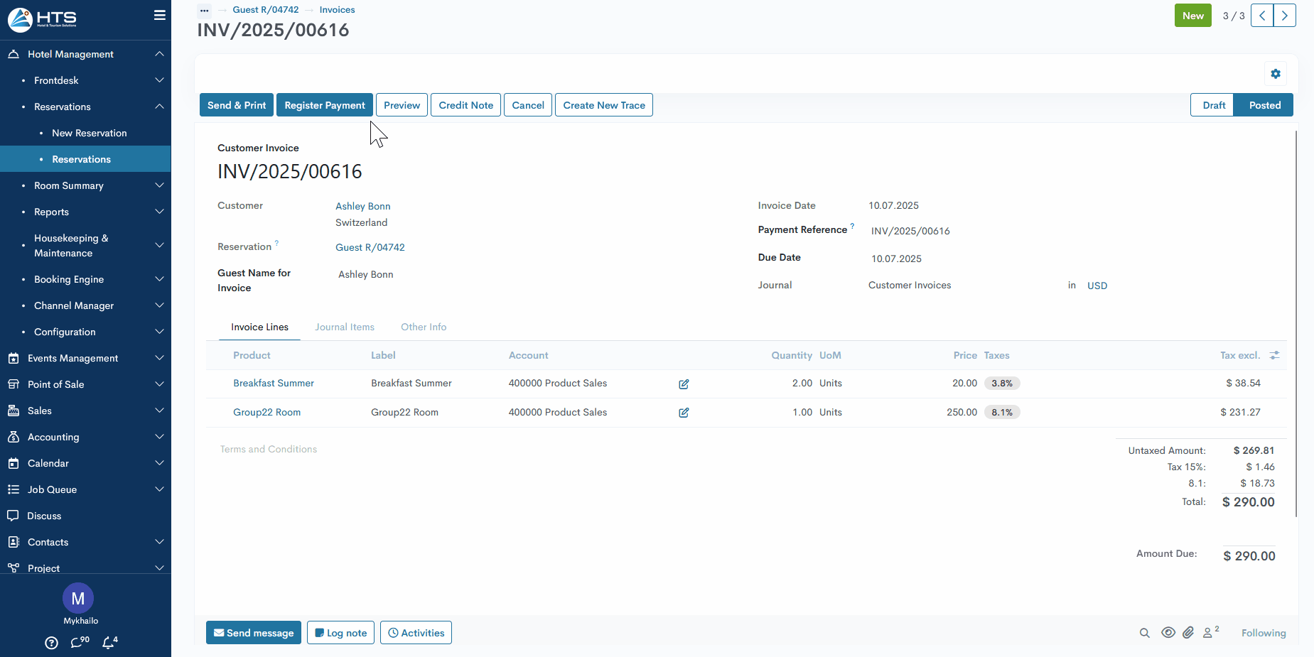 Nachdem eine Rechnung erstellt wurde, besteht der letzte Schritt darin, die Zahlung zu verbuchen. Öffnen Sie dazu die entsprechende Rechnung. Gehen Sie zur Reservierungsseite und klicken Sie oben auf die Schaltfläche „Rechnungen“. Falls mehrere Rechnungen aufgelistet sind, wählen Sie diejenige aus, die Sie bearbeiten möchten.