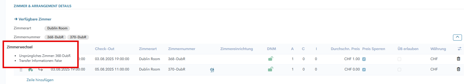 Sobald der Zimmerwechsel abgeschlossen ist, ändert das System die Checkout-Daten des ursprünglichen Zimmers und erstellt eine neue Zimmerzeile, die die Daten, den Zimmertyp, die Zimmernummer, A/C/I und die Preisgestaltung des Zimmerwechsel-Assistenten enthält. In diesem neuen Eintrag erscheint zu Beginn ein „Pfeil“-Symbol, das beim Darüberfahren mit der Maus Informationen zur vorherigen Zimmernummer und zum Grund des Transfers anzeigt.