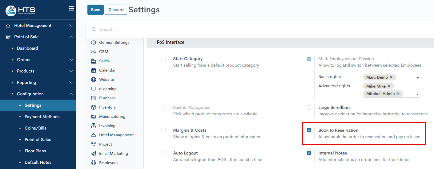 - in the section 'PoS' enable a checkbox near 'Book to Reservation';